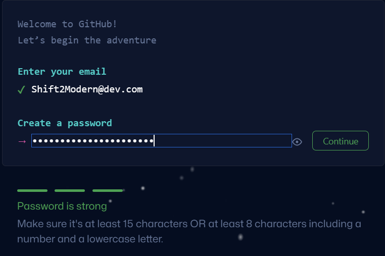 接着设置你的登录密码(密码要求至少 8 个字符以上,包含大小写字母、数字和符号或是 15 个字符以上的同类字符), 然后点击 Continue 按钮。